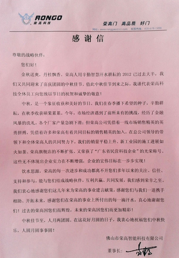 金秋送爽,丹桂飘香。荣高人用辛勤智慧汗水耕耘的2012已过去大半,我们又共同迎来了喜庆团圆的中秋佳节。值此中秋佳节到来之际,我谨代表荣高科技全体员工向您致以节日的祝贺和诚挚的敬意!
