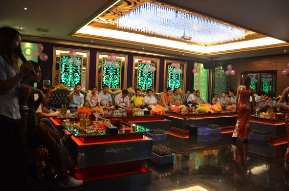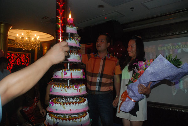 只见大院里满满地布置了30张酒席,密密麻麻地坐满了人,大鱼大肉布满酒桌,所有人的脸上都挂着幸福的笑容。一轮又一轮的敬酒过后,一个七层高的生日蛋糕映入眼帘,在黄董许愿完毕后,董事长夫人献上了早已准备好的鲜花。黄董惊喜万分,和夫人一起吹蜡烛、切蛋糕。晚宴现场掌声雷动、一片沸腾。