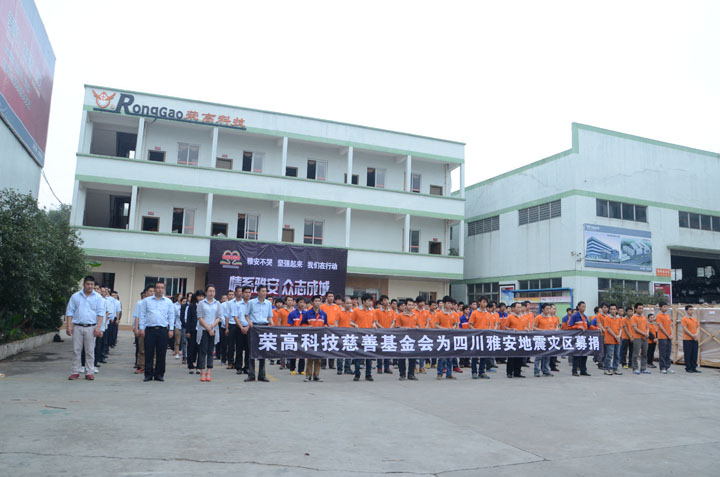 荣高科技2013年4月23日下午5:00总公司全体职工在公司广场集合,为发生7.0级地震四川省雅安灾区捐款。本次募集雅安地震专项救助资金分为3部分,第一部分:来自荣高科技慈善基金会的捐助资金中的雅安地震慈善专项款:人民币15000元,(慈善基金会理事会成员研究后决定的数目)。第二部分:来自今天捐款仪式上企业员工的捐款:46305.5元。第三部分:来自荣高科技全国的战略合作伙伴及荣高的供应商团队,到目前为此具体数额还在统计中,陆陆续续有代理商还在捐助,到25号再全部统计,一起上交到佛山市红十字会。做为四川省雅安地震专项捐助资金,由国家红十字会统一安排。