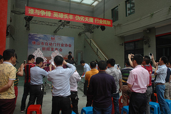 为了避免“害死自己、饿死同行、坑死用户”的恶性低价竞争蔓延,保障电动伸缩门行业的健康、持续发展,4月7日,佛山市自动门行业协会在佛山市金建星机电设备有限公司四楼召开“抵制恶劣竞争产品(天鹰门)”新闻发布会。发布会由协会秘书长邱健主持,协会会长陈标明、常务副会长朱宜文和常务副会长黄锦山先后在会上发言。协会理事、监事副会长以上的生产厂家、广告公司及行业媒体中国伸缩门网参加了发布会。