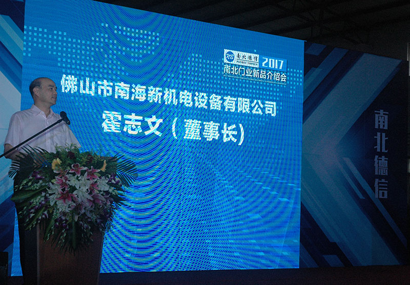 南北门业公司董事长霍志文率南北总公司、南北智控装备事业部、南北铝艺事业部、南北标准制造事业部等全体南北人列队欢迎行业领导和专家们的光临指导并致欢迎词。