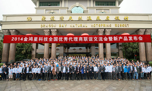 一年之计始于春,在春光明媚的3月,金鸿星迎来了2014全国优秀代理商联谊交流会暨新产品发布会,会议在在风景如画的佛冈聚龙湾酒店举行,来自全国各地的优秀代理商及公司管理层共300多人出席了本次大会,共同分享公司2013年销售工作取得的丰硕成果,明确金鸿星公司未来的品牌发展规划,并确立2014年的营销战略方向。