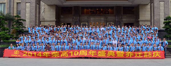 为热烈庆祝荣高成立十周年,回顾荣高十年来的发展道路,感恩伴随荣高一路走来的全体战略伙伴,表彰优秀人身事业伙伴,并向市场发布2014年新产品。荣高于2014年4月24日在美丽富饶的广东佛山举行“十周年盛典暨产业园乔迁誌庆”。