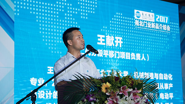 南北第二代分段平移门项目负责人王献开,毕业于西北工业大学,机械制造与自动化专业,2007年加入南北公司,任设计总监,一直从事产品设计的前期打样和后期完善与改良。曾参与《JG/T155-2003电动平开、推拉围墙大门》、《小区车辆出入口栏杆机》行业标准的的文本起草。主管公司自主研发的《悬浮式电动对开折叠围墙大门》先进标准的编写工作。